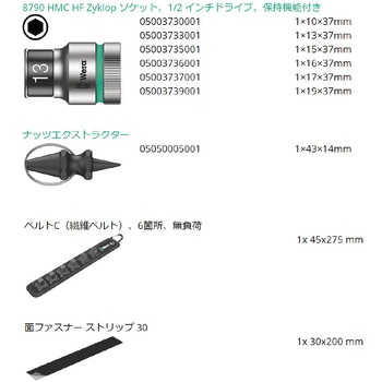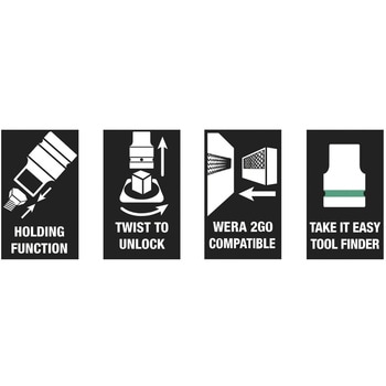 丈夫なテキスタイルベルトにセットされた7ピースソケット。スムーズにひねってロックを解除するメカニズムにより、しっかりとフィットし、ソケットを簡単に取り外すことができます。ベルト ループやバッグに取り付けるためのスナップ フックが付いています。保持機能付きソケットは、ワークに近づくときにねじを紛失するリスクを軽減し、特にねじ締めに便利です。壁、棚、工具トロリー、Wera 2go工具搬送システムなどに簡単に取り付けるための不織布裏面と面ファスナーストリップが付属しています。