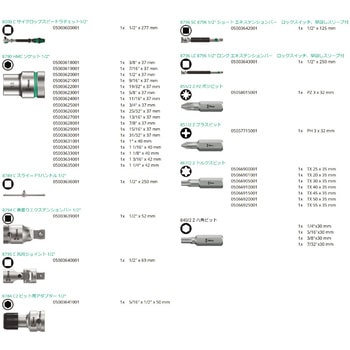 セット内容スピードラチェット 003600(1/2”×277mm)、ソケット 003618・003619・003620・003621・003622・003623・003624・003625・003626・003627・003628・003629・003630・003631・003632・003633・003634001・05003635(3/8・7/16・1/2・9/16・19/32・5/8・11/16・3/4・25/32・13/16・7/8・15/16・31/32・1・1.1/16・1.1/8・1.3/16・1.1/4”)、スライド式Tハンドル 003636(1/2”)、ウォブルエクステンション 003639(1/2”)、ユニバーサルジョイント 003640(1/2”)、ビットアダプタ― 003641(5/16”×1/2”)、フレキシブルロックエクステンション 003642・003643(1/2・1/2”)、ビット 057715・058015・066900・066901・066905・066910・066915・066920・066925(PH3・PZ3・TX25・20・30・40・45・50・55)、六角ビット 1/4”・5/16”・3/8”・7/32”内容量1セット
