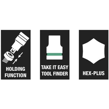 3/8インチのドライブと保持機能を備えたビットソケットは、ワークピースにねじを送り込むときにねじを紛失するリスクを軽減し、特に快適なねじ回しを実現します。サイズごとに色分けされた「Take it easy」ツールファインダーにより、工具を素早く簡単に識別できます。下端のローレット加工により、手動で使用する際のグリップ力が向上します。クロムバナジウム鋼、マットクロムメッキ仕上げ。