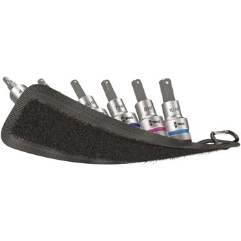 布製ベルトに1/2"差し込み六角ビットソケットが6点セットされており、省スペースで保管できます。ツイストロックにより、ソケットの取り付け取り外しがスムーズに行えます。ベルトループまたはポケットにしっかり引っ掛けるスナップフックが付属しています。"Take it easy" 色分けシステム: サイズに応じて色分けされており、必要なソケットを簡単に見分けれます。保持機能付きビットソケットで壁、棚、台車、Wera 2goシリーズ製品に取り付けることができます。