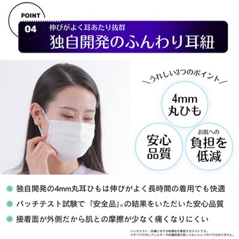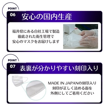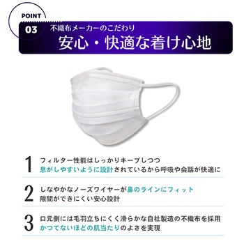 日本産業規格が制定した「JIS T 9001」に適合。医療用マスククラスⅠの品質基準をクリアしたマスクです。 マスクの表面にSEK認定の抗ウイルス加工不織布を採用した抗ウイルスマスクです。 長時間使用しても耳が痛くなりにくい独自開発の耳ひもを採用しました。 自社製不織布(スプリトップ)を使用した日本製高性能サージカルマスクです。 口元側には毛羽立ちにくくなめらかな不織布を採用しています。 ノーズフィットで鼻のラインにぴったりフィットします。