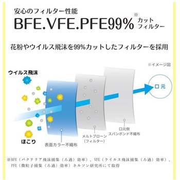 BFE、VFE、PFE99%カットフィルター採用した日本製サージカルカラーマスクです。贈答用に適したデザインパッケージです。長時間使用しても耳が痛くなりにくい独自開発の耳ひもを採用しました。口元側には毛羽立ちにくくなめらかな不織布を採用しています。ノーズフィットで鼻のラインにぴったりフィットします。
