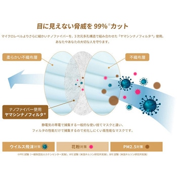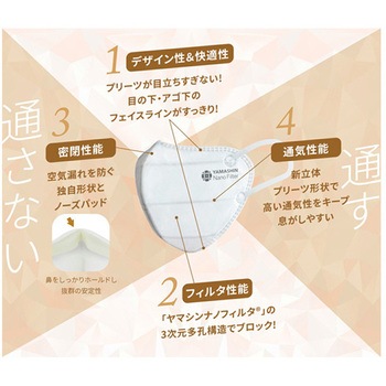 「高捕集力」ヤマシンナノフィルタの3次元多孔構造でブロックします。「高密閉性」空気の漏れを防ぐ独自形状です。「息がしやすい」独自立体プリーツ形状による高い通気性があります。押し洗いで繰り返し使用できます。すっきりとしたフェイスラインです。