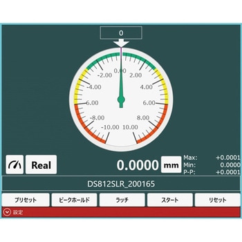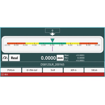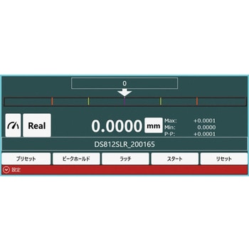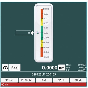主な機能:測定値表示切替・表示レンジ変更(±0.05μm~±250mm)・ゲージの名称設定・mm/μm表示切替・プリセット、ラッチ、ピークホールド・現在値、最大値、最小値、P-P値の表示・現在値の合否判定(赤、黄、緑の3色判定)・現在値のチャート表示・CSVデータ出力(取得時間、測定値、合否判定結果)