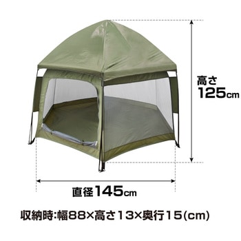 ●サイズ:展開時/直径1450×高さ1250(mm)、収納時/幅880×高さ130×奥行150(mm)●重量:約2750g●材質:ポリエステル100%、グラスファイバー、アルミ●内容品:本体、ハーフフライシート、ペグ6本、ペグ保存袋、本体収納ベルト、日本語取扱説明書
