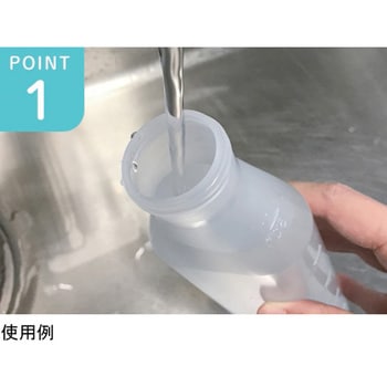 キャップ部に6つの穴を開けることで水やお湯がシャワー状に広がるタイプです。大口径(33.5mm)で洗浄液が入りやすく、目盛が有るので希釈が楽になります。本体材質を軟らかくしており、握る強さで水圧を変える事が可能です。透明なので汚れの付着がすぐにわかります。