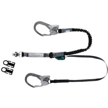 常時巻取式と伸縮式の2丁掛けランヤードです。伸縮式ランヤードの長さは約1.6mです。ストラップには常に巻取テンションが掛かっており、ロック機構と相まって落下距離を最短に抑えられる仕様のランヤードです。使わないときは短く縮んでいるため、移動時の引っ掛かりなどを抑えることができます。