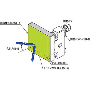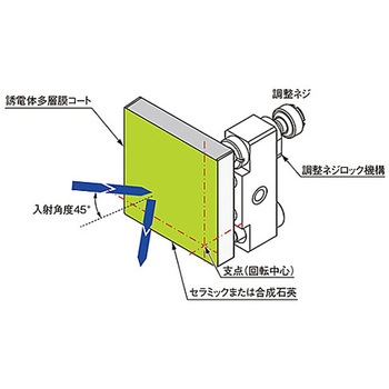 ミラーホルダーの枠を無くし、ホルダーの前面を全てミラーにしました。基板に熱膨張係数が小さいセラミックを高精度研磨しているので、きわめて高い面精度と温度安定性が得られます。YAGレーザの各種波長に使用できるラインナップを用意しています。ミラータイプは、高精度研磨したセラミックに誘電体多層膜をコーティングしているので、ガラスにコートされた誘電体多層膜ミラーとそん色ありません。極限までミラーの有効面積を拡大し、かつ、コンパクトなミラー調整機構を実現しました。温度変化によって反射波面が崩れることがないので、精密な光学系に最適です。この製品はコート後(ホルダーの状態)の面精度を保証しています。レーザ耐力が高く、ハイパワーレーザでも使用できます。この製品に関する特許は2011年11月に同社(株)が取得しています。ベースへの取り付け方法はMHGミラーホルダーと同様です。ポストスタンドPST-**(別売り)、ロッドRO-**(別売り)に取り付けが可能です。※誘電体多層膜は入射ビームの偏光状態により反射率波長特性が変わります。※P偏光はS偏光に比べて反射率が低く、反射帯域も狭くなります。※仕様の反射率は、P偏光とS偏光の反射率の平均値で表しています。※入射角度45°以外で使用した場合、反射率が低くなる可能性があります。※適応波長以外の波長で使用した場合、反射率が低くなる可能性があります。※面精度保証データは製品には添付されません。
