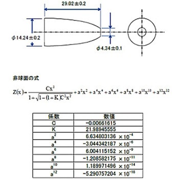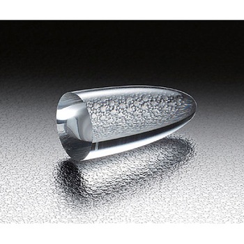 内部反射型放物面レンズは色々な方向から入射する光を、流線型の側面で反射させることで、出射端面に光を集めることができる光学素子です。太陽電池の集光器として利用されています。入射角度25°以下の平行光であれば、どの方向から入射しても効率良く出射端面に光を集めることができます。ガラスの内部反射を使用しているので、レンズ系と比較して構成が単純化できます。ガラスレンズのプレス成形技術を用いることで、高性能と低価格の両方を実現しました。※側面(非球面)で全反射させているので、側面に指紋や汚れが付くと反射率が極端に悪くなります。※側面の反射率は99%以上ですが、入出射面は反射防止コーティングを施していないのでそれぞれ4%程度の反射損失が発生します。※端面から出射した光は1点に集光せず、大きくランダムに発散します。※このため、集光ビームやコリメートビームの用途には使用することができません。