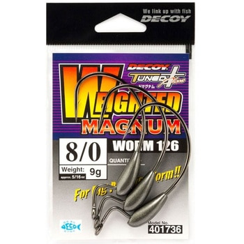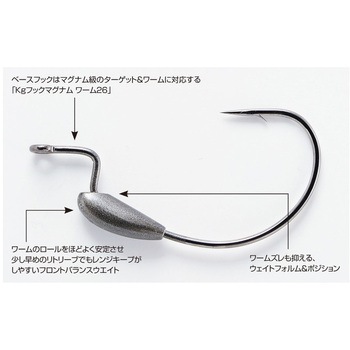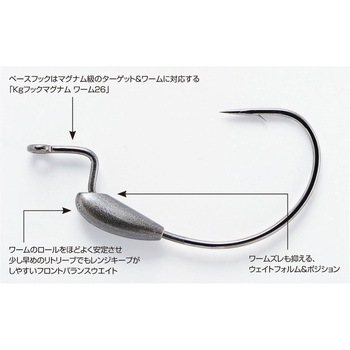強烈なアクションを発生させるマグナム級のビッグワームは、リトリーブスピード等により自らのバランスを崩すほど動きすぎることがあります。「ウェイテッドマグナム ワーム126」はそんなワームの暴走を抑え、安定して泳がせるためのウェイトをシャンク部分に装備。ベースフックは太軸設計の「キロフックマグナム ワーム26」。マグナム級のターゲットと対峙する為のスイミングスペシャルモデルです。