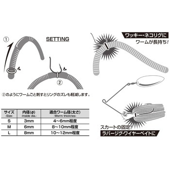 ストレートワーム等に装着することでワームへのダメージを軽減し長持ちさせるフックキーパーリングです。伸縮性のあるシリコン素材を採用し、装着しやすく耐久性が高いのが特徴です。また、スピナーベイトや自作ラバージグのスカートを簡易的に固定したり、複数本使用しフレアー調整することも可能。