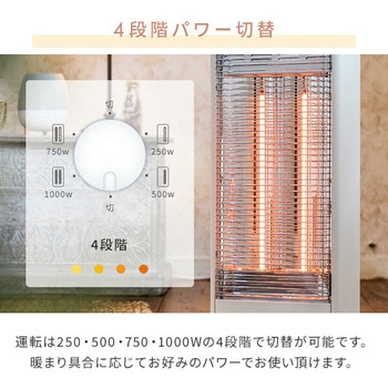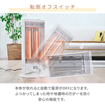 超速暖0.2秒ですぐあたたかい。4段階切替(250・500・750・1000W)でお好みの暖かさに設定可能。約130度の範囲の手動首振り運転に対応。本体が倒れると自動で電源がOFFになる転倒オフスイッチ機能付き。軽量コンパクトで持ち運びラクラク。本体背面に取っ手が付いているので、お好きな場所で使えます。操作部はスイッチの切り替えがしやすいダイヤル式。初めての方でも簡単にお使いいただけます。