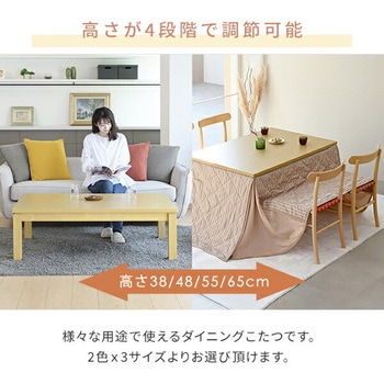 高さが4段階で調節できるダイニングこたつ。年中使えて便利。継脚付きで4段階の高さ調節が可能(38/48/55/65cm)。届いてすぐに使える布団セット。コード収納ボックス付。冬はこたつ、夏はテーブルとして使用可能。
