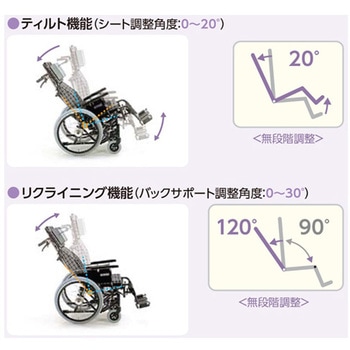 KXのシンプルタイプ、元祖ティルト&リクライニング車いす、無段階調整、"拘束ゼロ"の座位保持をめざして、前後折りたたみ式、ラクまくら、▼角度可変式ヘッドサポート、▼可動域:前方32cm・後方19cm・上方36cm・左右20cmまで可動。、▼※工具なしで取付・調整可能です。