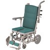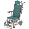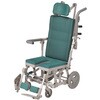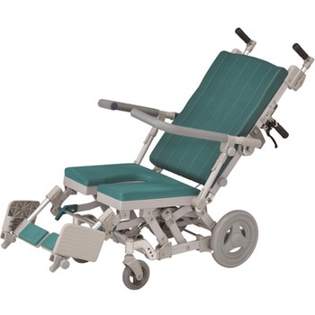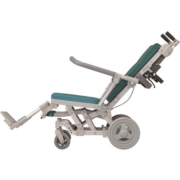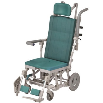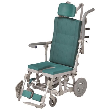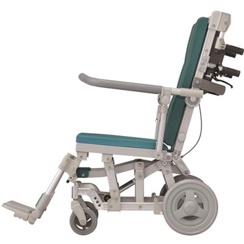 体の前まである肘掛けが、利用者が前に倒れるのを防ぎます。また、前方グリップを握って座位を保つこともできます。、肘掛けにはロック機能がついています。解除しないとはね上がらないので、安心してお使いいただけます。、肘掛けは左右ともはね上げ式ですので、浴槽などへの横移乗が楽に行えます。、リクライニング時には座面が前に移動しながら低くなりますので、車体の重心が安定し、後方に倒れにくい構造です。(重心移動)。また、座面の角度が上がり身体のズレ防止に役立ちます。