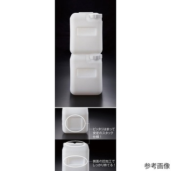 PFA製回転成形容器の角型バージョン、目安メモリ付きです。、オールフッ素樹脂製なので、耐薬性・耐熱性に優れ、あらゆる薬品の保管や運搬等にご使用いただけます。、上下に設けられた凹凸にあわせて段積みが可能。角型形状なのでスペースを取らずパレット積みも可能です。省スペース化を可能とします。、本体の側面2箇所に凹み部がありますので、指を入れて持ち運びが容易です。