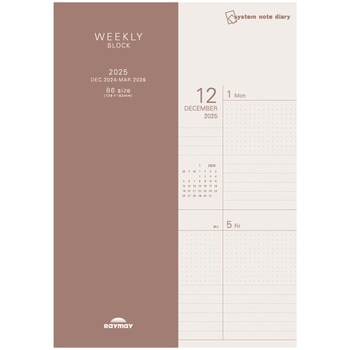 見開き1週間で、ドット方眼と罫線入りのブロックフォーマット。 TODOリスト&スケジュール管理、イラスト&一言日記や記録など多様な使い方ができる。日付期間:2024年12月~2026年3月ブロック式ウィークリー(見開き1週間) ノート6ページ B6サイズ