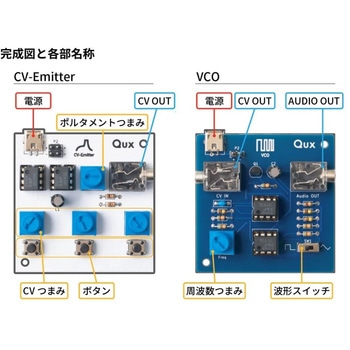 難しいと思われがちなアナログシンセサイザーを簡単に作りあげて演奏することが可能な電子工作キットです。 基板とケーブルだけで楽器が完成する、手のひらサイズの手作り電子楽器です。 モジュール中部のつまみ3つで出力する電圧の大きさを決めて、つまみの真下のタクトスイッチを押すことで設定した電圧を出力します。 モジュール上部のつまみを回すと、スイッチを押したときの電圧の変化の滑らかさを変えることができます。 CV INから入ってきた電圧に対応する周波数の電圧を出力=入ってきた電圧に 対応するピッチ(音程)の音を出力します。 CV INに何も繋がないときはつまみで音程を変えることができます。 右下のスイッチで、出力する波形を矩形波か三角波に変えることができます。 組み立てやすい部品選定で詳細マニュアルも付属し、2種のキットははんだ付けしやすいよう部品を選定してあるので電子工作入門にも最適です。