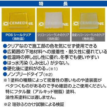 高透明で多用途なシーリング材です。クリアなので施工部の色を気にせず使用できます。広範囲の下地材料への接着性・耐久性に優れています。低温時の押し出し性に優れ、冬季でも使いやすいです。はっ水汚染(しみ出し)が少ないです。硬化後に塗料がのります。ノンブリードタイプです。