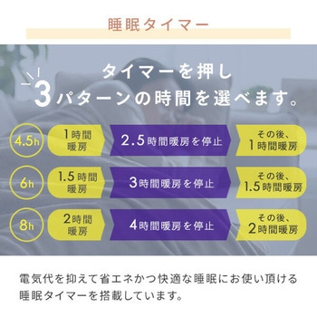 睡眠時に使えるタイマーを3パターンから選択可能。(睡眠前後の暖房で快適な眠りを得られます)