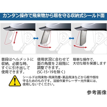 ムレの原因となっていた発砲スチロールを無くし新たに2重構造のパッドを採用。ヘルメット内部の空間が広がり、通気性が格段に向上しました。また、エラストマーを使用することにより衝撃を分散させる安全設計になっております。、すべてが樹脂製のため、そのまま水洗いができます。気になる汚れや匂いの付着を防ぎ、毎日、快適にお使い頂けます。、収納式の防災面で、キズや衝撃に強い、ハードコート処理済みポリカーボネートを使用。メガネやマスクとの併用可能。、アゴバンドを固定する耳紐の採用で前後からの衝撃によるヘルメットのズレや脱落を防止します。、RAバンド:柔軟な素材と、後頭部を包むようにジャストフィットする湾曲形状。ヘルメットのぐらつきを防止します。、前後・左右のベンチレーション(通気孔)により、頭部のムレを効果的に軽減。安全で快適な作業に寄与します。、帽体周囲に雨天時の屋外作業で効果的な、レインガード(雨垂れ防止溝)を設けています。、※本製品は乗車帽ではありません。自転車・バイク等では使用しないでください。、※シールド(面)は飛来物・飛来防じん・薬品飛沫などから目や顔を守るものです。溶接作業(赤外線)やレーザ光作業には絶対に使用しないでください。、※クレジットカードのような固い材質のIDカードは使用できません。
