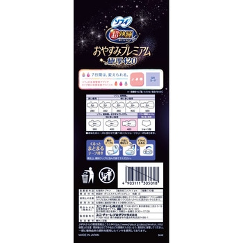 極厚クッションがからだにぎゅっと密着して安心、ワンランク上のおやすみへ●超熟睡シリーズ最厚※1の極厚クッションを搭載。からだにぎゅっと密着してスキマを埋めるから、伝いモレ安心。●夜用ナプキン※23枚分の吸収力。●プレミアムナイトデザインの個別ラップ。<以下注釈>※1超熟睡現シリーズ吸収体中央部分。※2メーカーナイトガード26cm羽なし比。医薬部外品