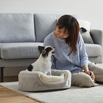 素材にこだわったトレンド感のあるおしゃれなクッションペットベッドです。ドームタイプ・ソファタイプの2WAY仕様です。こだわりの生地を使用しています(ラビットファー調、シープボア調)。トレンド感のあるおしゃれなカラーです。素材の質感も相まってインテリアにマッチします。クッションは手洗いが可能で、いつでも清潔です(本体は洗濯できません)。ベッドの底面には滑り止め付きで安心です。底面にホットカーペットのコードを通す穴が3か所付いています。