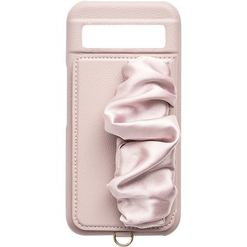 落下防止にもなるシュシュバンド機能。2カードポケット、ミラー付き。お持ちのストラップを取り付けられるストラップ用Dカン付き(ストラップは付属しません)