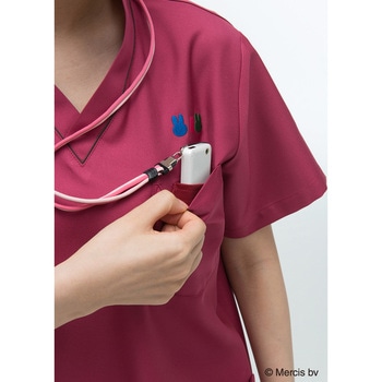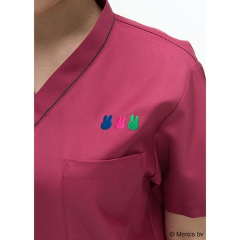 miffyの絵本に使用されているうさぎのモチーフを胸元に刺繍し、衿元、ポケット口に配色のコードパイピングを挟み込みました。大人っぽい配色で、いままでにない雰囲気のスクラブになっています。ポケット口に挟み込んだブルーの織ネームもポイントになっています。