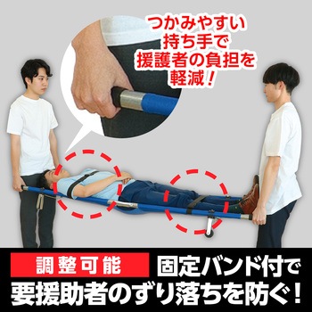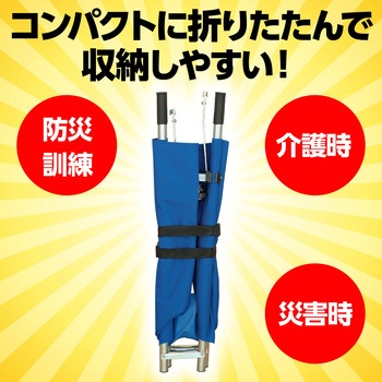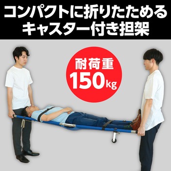 コンパクトに収納できる、キャスター付き担架未使用時は折りたたんでコンパクトに収納できる担架です。ベルト付きで安全、キャスター付きで運びやすい耐荷重:150kg。材質:鉄、ポリエステル。サイズ:使用時:約550×2000×180mm、折り畳み時:約230×230×1000mm