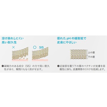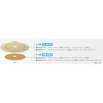 ▼組成の異なる二種類の皮膚保護剤を上下二層に配置し、皮膚保護剤に求められる特性をバランスよく実現しました。初期タック力、水分吸収力に優れると同時に耐水性が高く、膨潤作用により皮膚保護剤がストーマ粘膜に密着するため排泄物が皮膚に接触するのを防止します。下の層にはpH緩衝能の高いペクチンを配合し、皮膚を弱酸性に保ちます。※貼付期間の目安は、発汗量、排泄物の性状やストーマ周囲皮膚の状況により変わります。皮膚保護剤の分類はJSSCR分類に準じます。