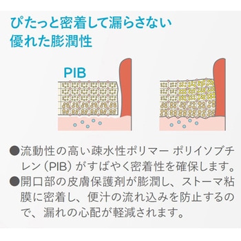 ▼開口部の皮膚保護剤が膨潤し、ストーマ粘膜に密着し、便汁の流れ込みを防止するので、漏れの心配が軽減されます。