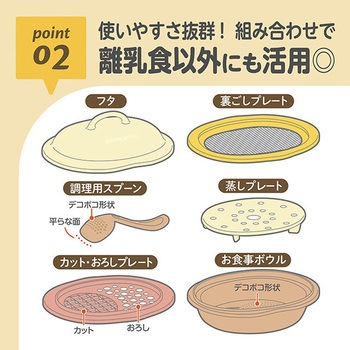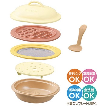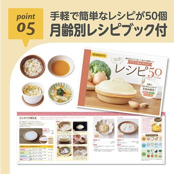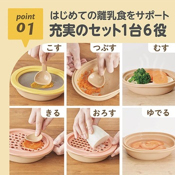 離乳食作りに必要な機能を全部そろえた、離乳食調理セット「つぶす、こす、きる、おろす、ゆでる、する」の1台6役!調理しやすく、重ねて収納もできる、かさばらないサイズです。月齢に合わせたエジソンママのオリジナルレシピブック付き。