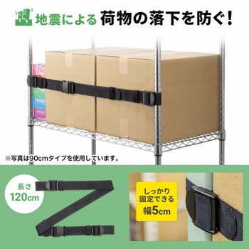 オープン棚に収められた書類、ケースなどの収納物の落下を防止するベルトです。