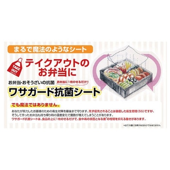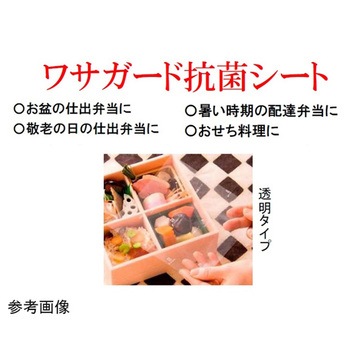 ワサガード抗菌シートはお弁当や仕出し、おせち料理にご使用頂く以外にもデリケートな和菓子や、果物などにもご採用頂いております。菌を抑え食品の鮮度を守る為にご利用ください。ワサビやカラシの成分で調理済みの食品を守ります。水分が無い場所では成分は揮発しないので取扱に気を配ることが少なくてすみます。開封時、匂いがしません。湿気を避けて保存すれば完全に密封しなくてもかまいません。素材はレーヨン紙とPETフィルムです。一度ご使用になったものは再利用できません。オーブンレンジには使用できません。