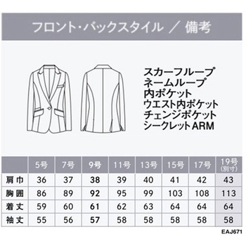 立体的なシルエットがエレガントで美しい落ち着いた印象のロング丈ジャケット。女性の知的さを引き立てる控えめなピンストライプがこだわり。スマートなデザインと相まって、芯の通ったスタイリッシュな美しさを感じさせます。3種類のネックレスに合う黄金比のデコルテ開きを実現。40cm、50cmタイプはもちろん、60cmのロングネックレスにも合うようデコルテの開き具合を緻密にデザインしています。凛とした女性像を描く「品格のストライプ」の素材を使用。ふくらみのあるマットな肌ざわりが上品で落ち着いた印象を与えます。ストレッチ性、反発性に優れ、シワができにくく、さらに抗菌防臭、静電気防止と機能が満載。接客サービスにうれしい、ENJOY Noirオリジナル素材です。