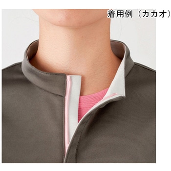 スポーティーな印象のスタンドカラーは、首周りに圧迫感を与えないスタンドオフ仕様。配色されたライトグレーは衿裏で明るい表情をサポート。脇ラインでシャープにタテラインを強調したすっきりシルエットを演出してくれます。半円状にカットした配色ポケットは全体イメージを優しく調和し、また、物の出し入れが容易で使い勝手の良い形状です。比翼仕立てのフロントファスナーは、ケアされる人のことを考えた優しさ仕様。お仕事の体温調節として気軽に羽織れる一枚です。