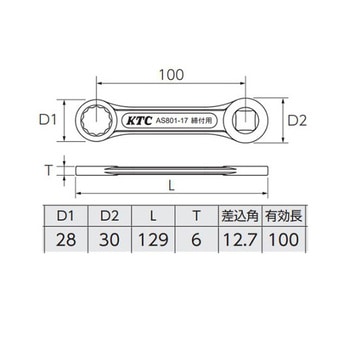 1/2"差込角付きの締付専用レンチ。ロックナットとドライブシャフトの隙間が狭い車両に適しています。口径側、差込角側にパワーフィット形状を採用。より確実な緩め、締付け作業が可能。1/2"差込角付きで、トルクレンチを用いて締付トルク管理が可能。有効長は100mmで、トルク換算が容易に行えます。
