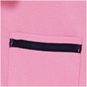 熱がこもりにくいスキッパーカラー。左袖に便利なペン差しポケット付。前裾はもたつきにくく、後裾は長めで安心感があります。胸ポケットに付けたテープで耐久性アップ。ネームホルダーを付けてもポケット口が垂れ下がりにくい仕様です。着脱がしやすい大きめのボタンです。