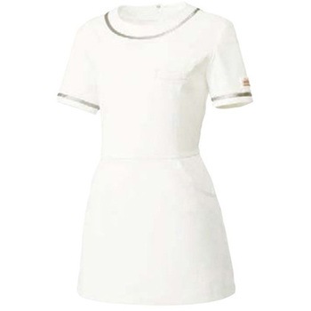 厚みがあり、上品な雰囲気を与える「ストレッチラチネ」。軽い着心地と、しっかり伸びるストレッチ性能、チリやホコリが付きにくい制電性能と、快適、清潔な機能が充実した生地です。オリジナルネーム付、首元や袖口にサテンテープを施したシンプルなデザインのワンピース・チュニック。高めのウエスト位置でスタイルアップ。