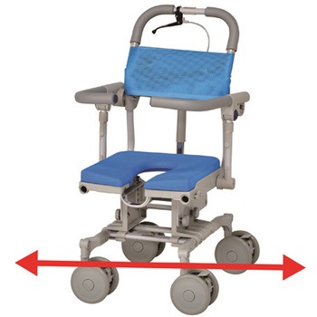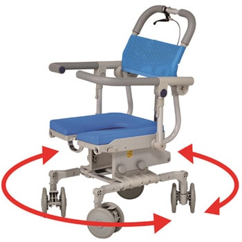 自在輪で方向転換も楽々 シートを傾けて座位を安定 コンパクトなシャワーキャリー、チルトレバーを握りなが ク機能付きで安心。 らハンドルを押し下げるとチルトができます。ガスシリンダータイプなのでスムーズです。(6°~22°、無段階)、小回りがきくので、その場での本体360度の転回が可能です。また、4輪すべて自在輪ですので、お風呂やベッドへの真横にも移動ができます。肘掛けが前に回っているので、利用者が前に倒れるのを防ぐことができます。また、肘掛けの前を持つことによって座位保持がしやすくなります。肘掛けははね上がるので、乗り降りの邪魔になりません。