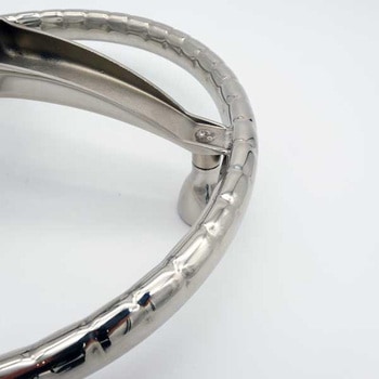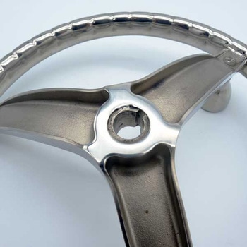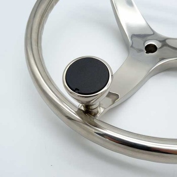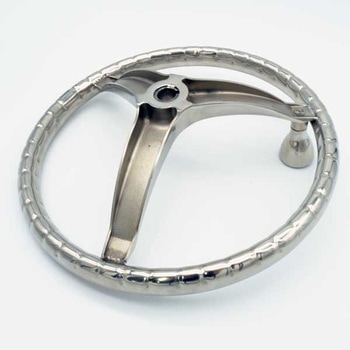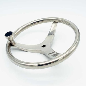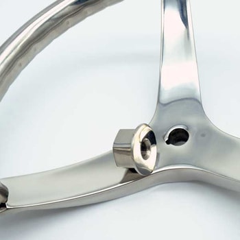 このステアリングホイールは交換用のホイールです。現在使用されているホイールが老朽化で破損してしまった場合こちらのホイールで交換することができます。ステンレス316の素材を使用しているので金属の輝きの美しさが際だち、更に腐食などに耐性が強いステアリングホイールです。持ち手には指がはまるグリップが彫られており、大変操作がしやすくなっています。ホイールのステアリングノブは装着されております。ホイール本体、真ん中のボルトを覆うためのセンターキャップ(ステンレスナット)は付属しております。