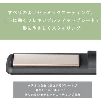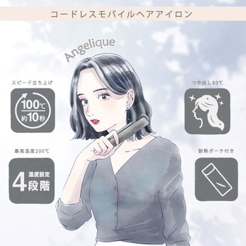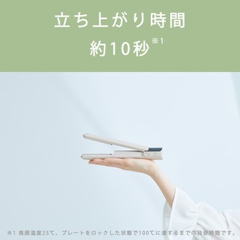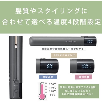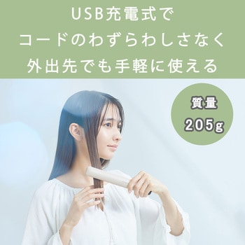 USB充電でコードのわずらわしさなく外出先でも手軽に使える。立ち上がり時間約10秒。髪質やスタイリングに合わせて選べる温度4段階設定。すべりのよいセラミックコーティング、上下に動くフレキシブルフィットプレートで髪にやさしくスタイリング。