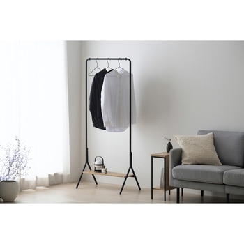 ハンガーには衣類をかけて収納し、棚板にはカバンなどの小物が収納できます。高さ150cm(棚板までは129.5cm)でコートなど丈の長い衣類も掛けられます。