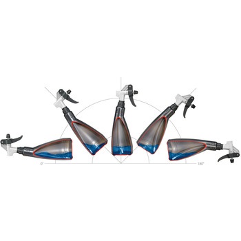 噴霧量が2種類切り替え可能。握る時も離す時もスプレーが出るので効率が良い。柔軟な吸引ノズルでボトルが傾いてもスプレー可能。