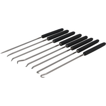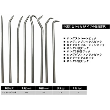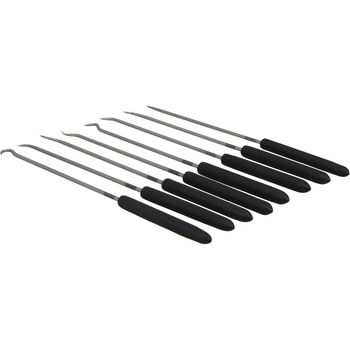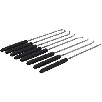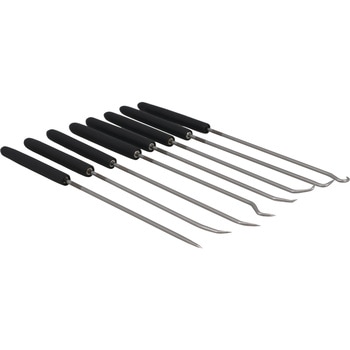 クッショングリップ付きのフック&ピックセットです。作業に合わせた8タイプの先端形状です。ロングタイプのフック&ピックで狭いスペースに最適です。クッショングリップハンドルで快適に作業できます。本体は熱処理されております。
