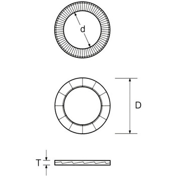 ステンレス材の緩み止めワッシャー。幅広タイプ。ノルトロックの緩み止めシステムは2枚組のワッシャーから構成しており、内側のカム面とカム面を向かい合わせにして使用します。カムの角度(α)はボルトのネジリード角度(β)よりも大きく設計されており、外側は放射状のリブを刻んでおります。ノルトロックをボルトナットにセットし締結していくと2枚のワッシャーのカム面とカム面が自動的にセットされます。その後増し締めをする際には外側の放射状のリブが相手材及びボルトナットの下面に食いついて固定されます。従って振動や衝撃により緩みがおきようとしてボルトナットが回転しようとすると内側のカム面とカム面のみ回転する事ができる。内側カム角度(α)はネジリード角度(β)よりも大きく設計してある為カムを簡単に乗り越える事はできません。