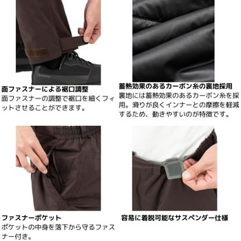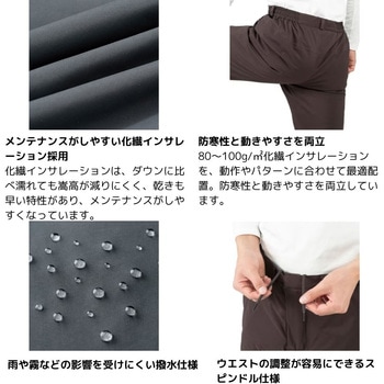 メンテナンスしやすいインサレーションレインパンツシマノ独自の防水透湿基準ドライシールド+をクリアしたメンテナンスしやすい化繊インサレーションレインパンツ。少ない枚数で暖かく軽い着ごこちを実現するサーマルレイヤードに適したアイテムで、従来品RB-04PUと比較してメインのインサレーションを125%へ増量しました。釣りの動きを考慮し、100g/m2、80g/m2のインサレーションを寒さを感じやすい部位と可動性を重視する部位に合わせて配置し動きやすさにも配慮しています。