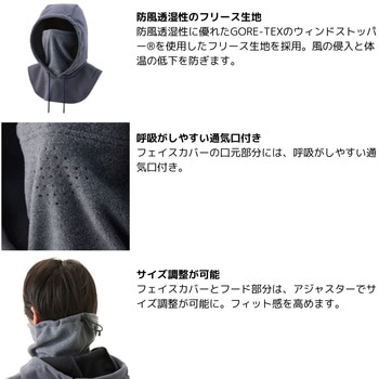 防風フリースを採用した、保温性の高いウィンターマスクゴアテックス ウィンドストッパー(R)素材の防風フリースを採用し、保温性に優れたフードウォーマー。フェイスウォーマー部分はサイズ調整可能なアジャスター付きで、口元は通気孔があり呼吸しやすい設計。寒さから身体を守るには最適なアイテムです。