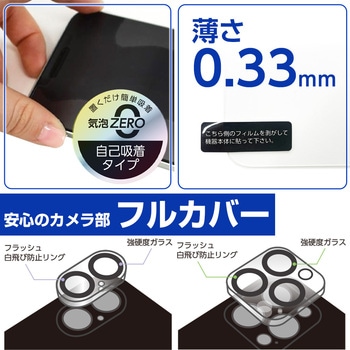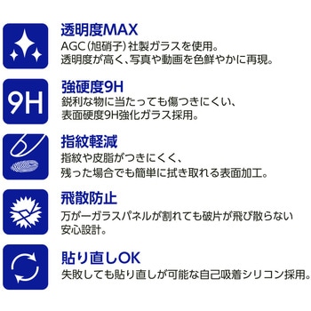液晶保護ガラス&カメラレンズガードのセット。AGC(旭硝子)社製ガラスを採用した透明度が高く、強硬度9Hの高品質で、写真や動画も色鮮やかに再現します。皮脂や指紋が付きにくく残っても簡単に拭き取れる表面加工、ガラスパネルは割れても破片が取り散らない安全設計です。失敗しても貼り直しが可能な自己吸着型シリコン採用です。